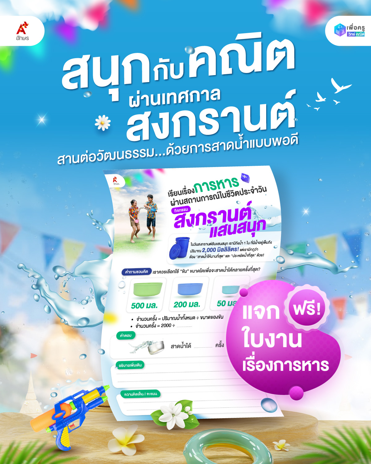 มาเปลี่ยนการเล่นน้ำให้เป็นการเรียนรู้กันครับ กับใบงาน "สนุกกับคณิตผ่านเทศกาลสงกรานต์" ที่จะช่วยให้เรื่องการหารไม่น่าเบื่ออีกต่อไป
